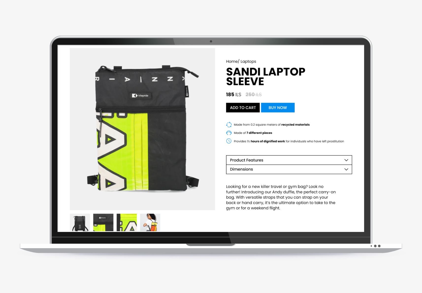 Kitepride is a fashion online store, that focuses on beautiful recycled hand made bags. Their goal is to create a second chance for both people and materials by providing a safe and dignifying working space, paying respectful living wages and saving as many materials from landfills. The new website design strategy was to bring the product to the front, proving it's value for money on top of the brand unique story and activism. And at the same time having the company's doing take part of the users scrolling.